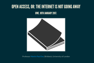 I think there is an uncomfortable truth in that many researchers do not really understand the economics of journals and book publishers and their relationship with the academy. Back in January, Professor Martin Eve came along to a session organised by the UWE Library Research team to talk about open access and how the economics behind it operate in a talk he entitled “Open Access, or: The Internet is not going away“.